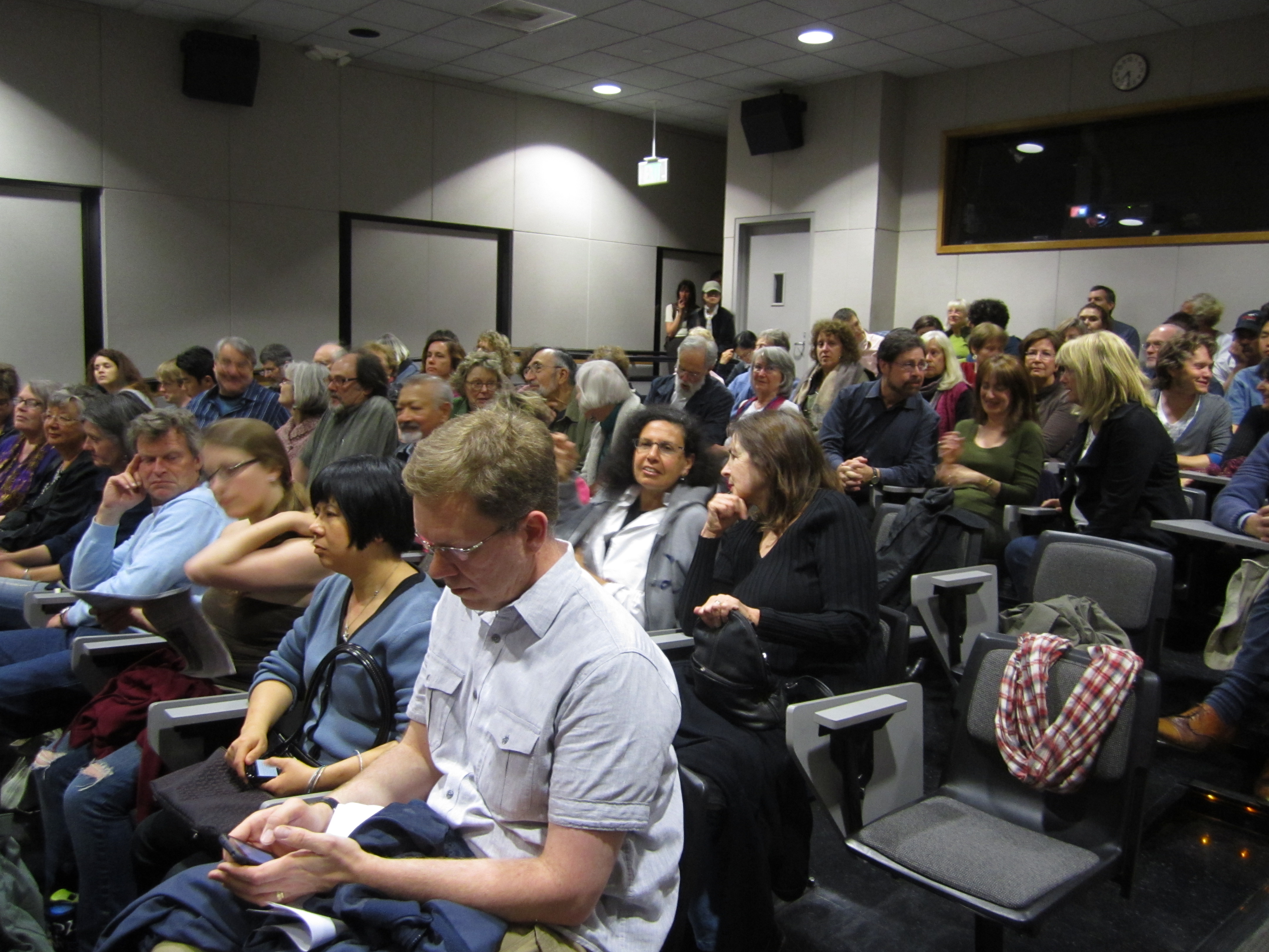 Did I just say the word “ably”? In fact, Amanda and Laura were fabulous! As you can see from the photograph — as hosts, they shone with every bit of the star quality as their guest. And the hall was packed to the gills.