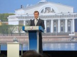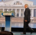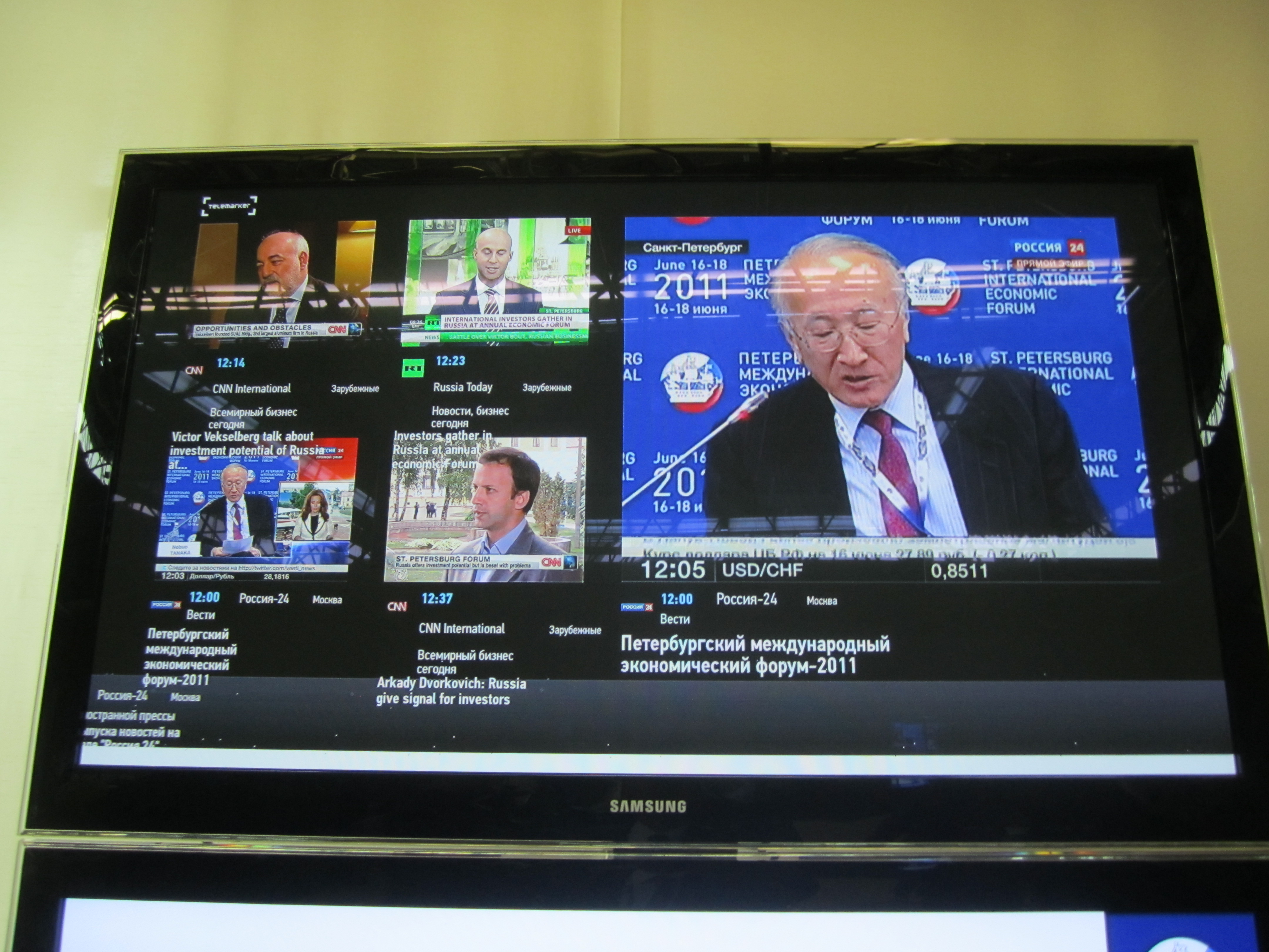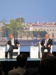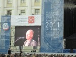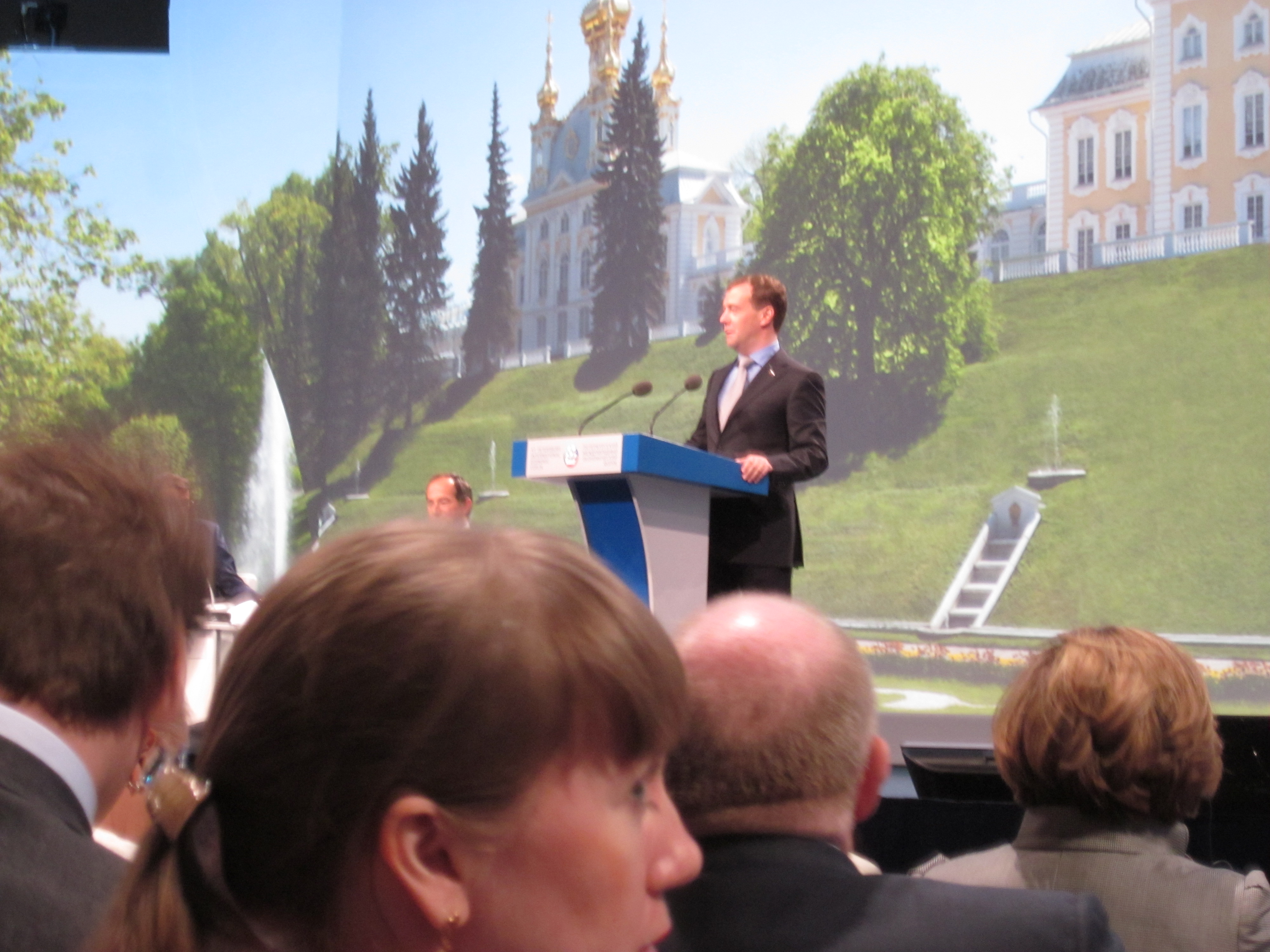 On the last day, we attended speeches by Russian president Dimitry Medvedev and French president Nicolas Sarkozy. Sarkozy, btw, decided to throw away his written notes provided to him by his aides, and speak off the cuff. It was the most jumbled set of ideas and expressions ever placed into perfect English translation. Notice in these photos, by the way, the emphasis on modernity by reference to a Russian Imperial past. The background mural on the stage, and for that matter, the entire Forum surroundings as depicted on the murals of the pavilions is a projected image of Peterhof palace (Petrodvorets) — a famous residence of Russian Tsars on the Finland coast.