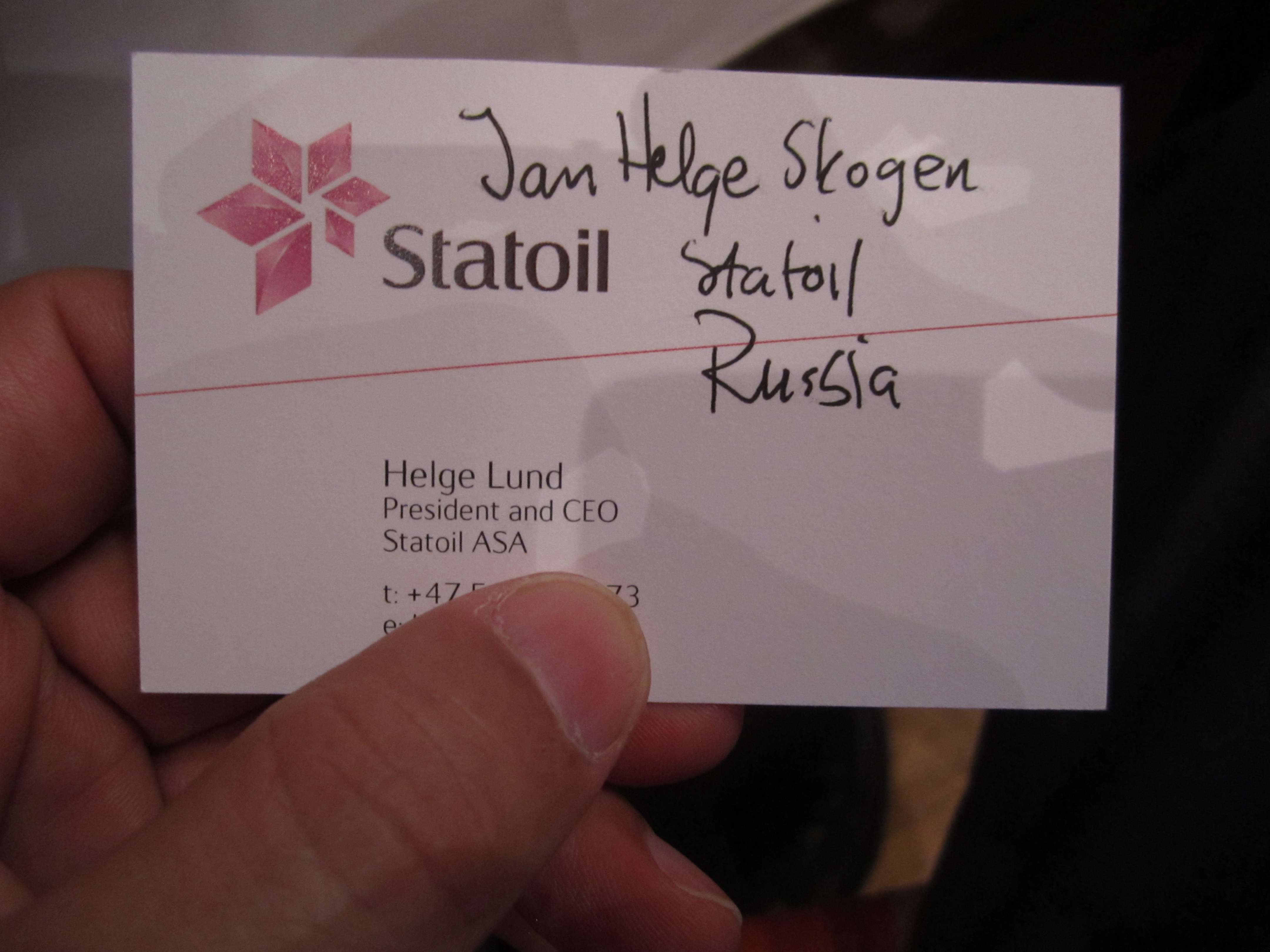 I expressed curiosity to Helge about who had taken over as the new head of Statoil in Russia, and he promptly wrote down the name Jan Helge Skogen, with an invitation to contact him so that he could make the connection.