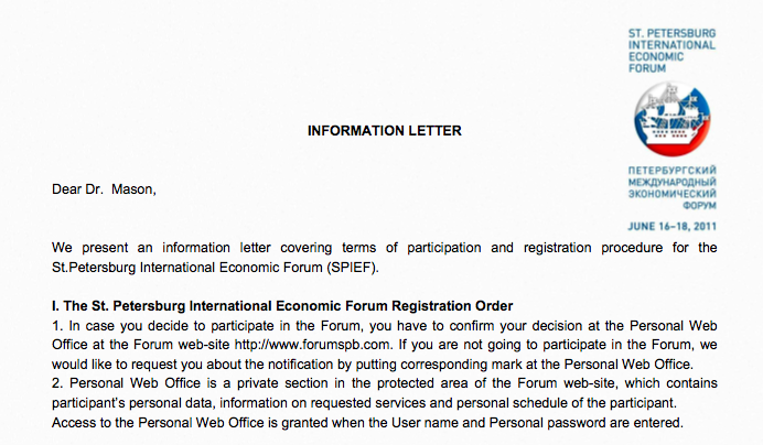 5/18: I just received confirmation from Goar Shaginyan about participation at the St. Petersburg International Economic Forum. I also bought the jet plane ticket to Russia. Exasperating. I sat continually pressing the purchase link only to be denied the least expensive flight. I gave in and purchased something in the mid range.