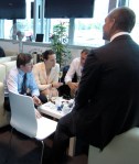 I’m sitting at this moment in the front row next to Geoffery Smith, Dow Jones journalist in London, Macro Economics, former Moscow Bureau Chief, sent wherever there’s a hole in the line, covering typically Eurozone situations, but sent here to fill in loose ends.