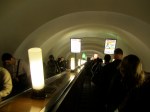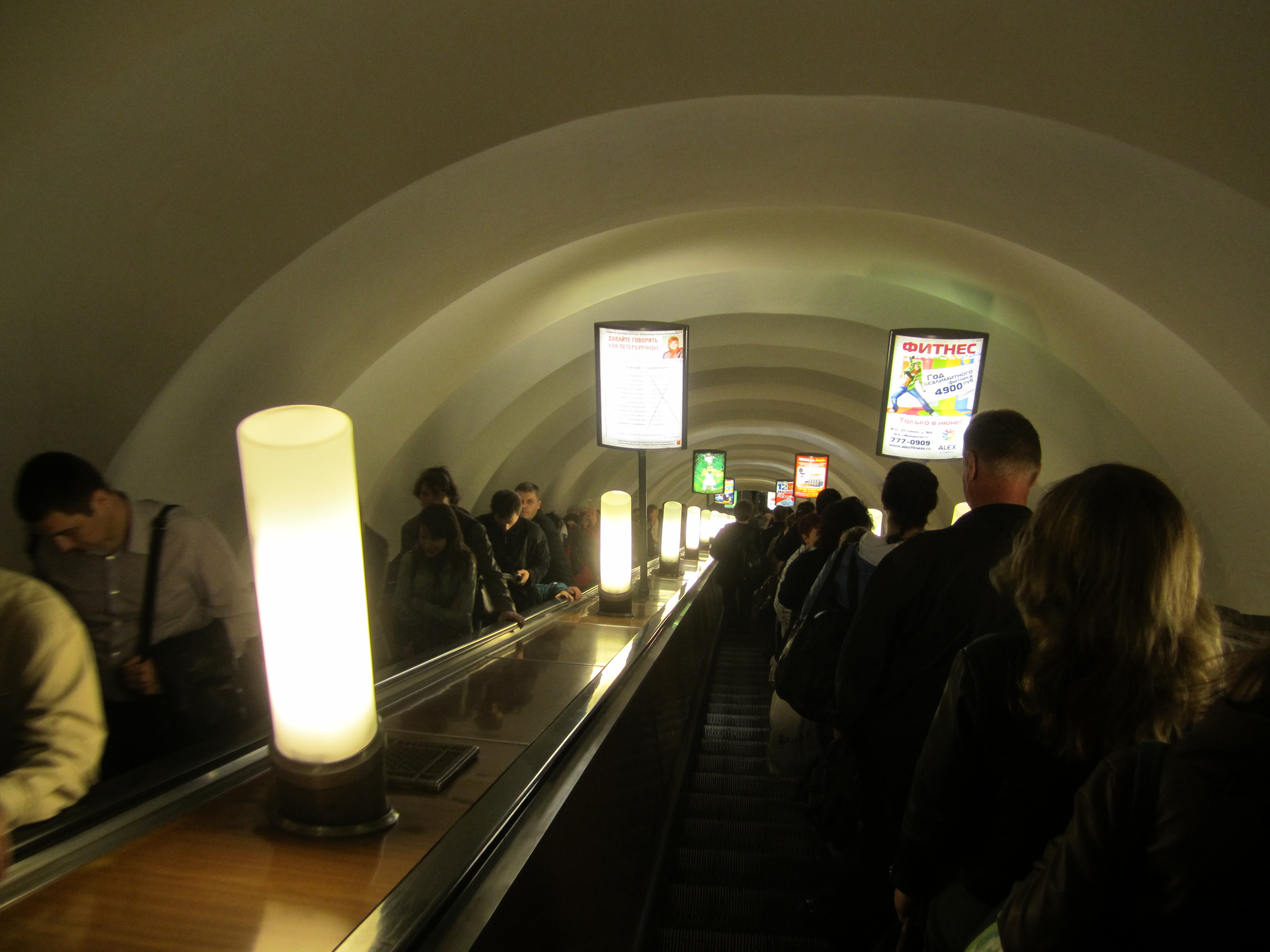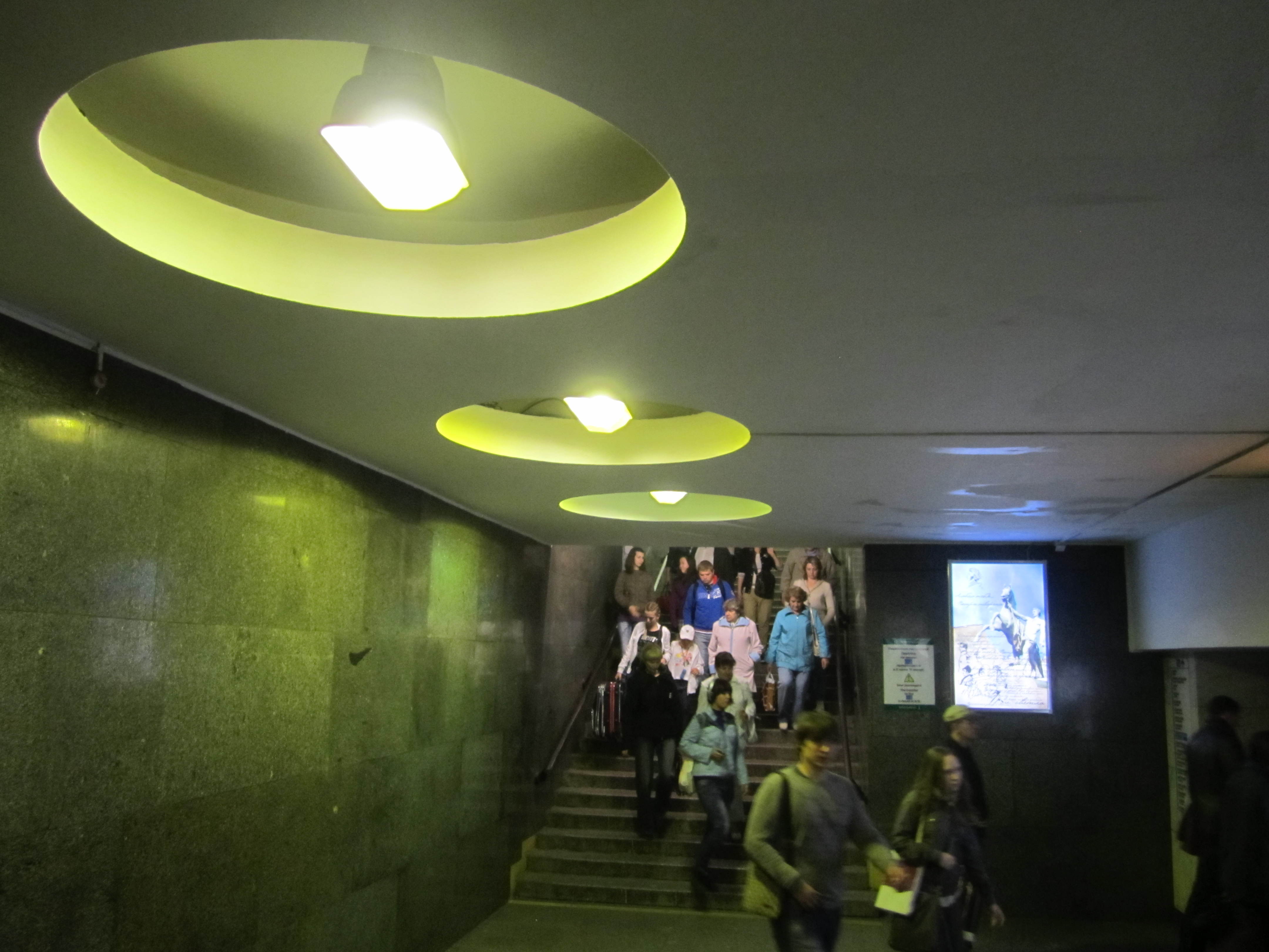 On the way, I took notice of the type of lighting in the St, Petersburg metro. Fluorescent lights, sodium lamps, green (?) lights, reflected and direct lighting. The foot-candle illumination of the St. Petersburg metro system has got to be pretty high– you can read a book by it, and possibly thread a needle.