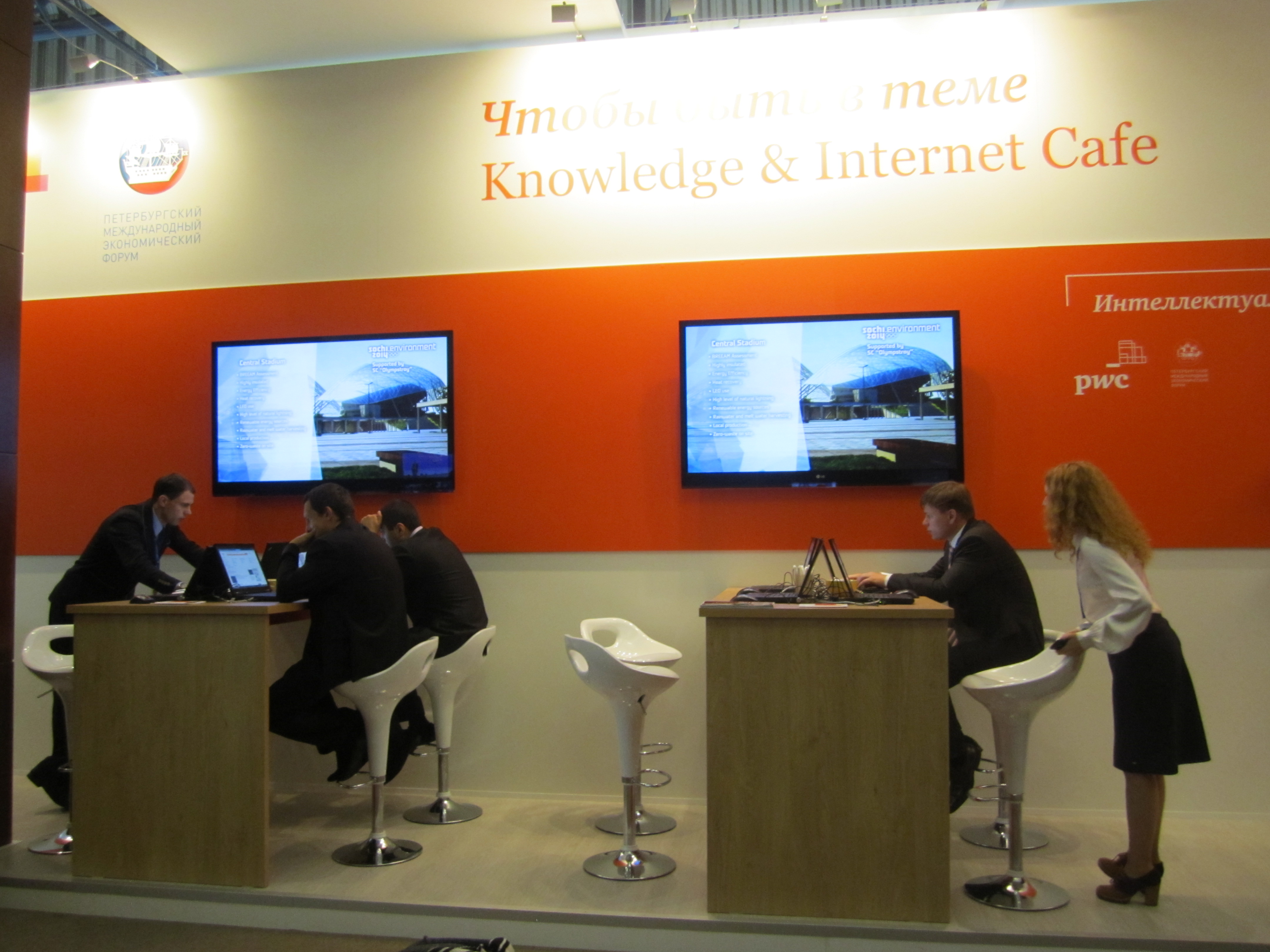 In the energy pavilion I found four points that seemed cardinal: Chess Lounge; Internet Knowledge Cafe; Gazprom installation; Russian financial concern, Sberbank. In between a lot of things happen– art installations, closed meeting rooms for executives, journalist booths, chatting, wandering, reading newspapers, drinking wine.