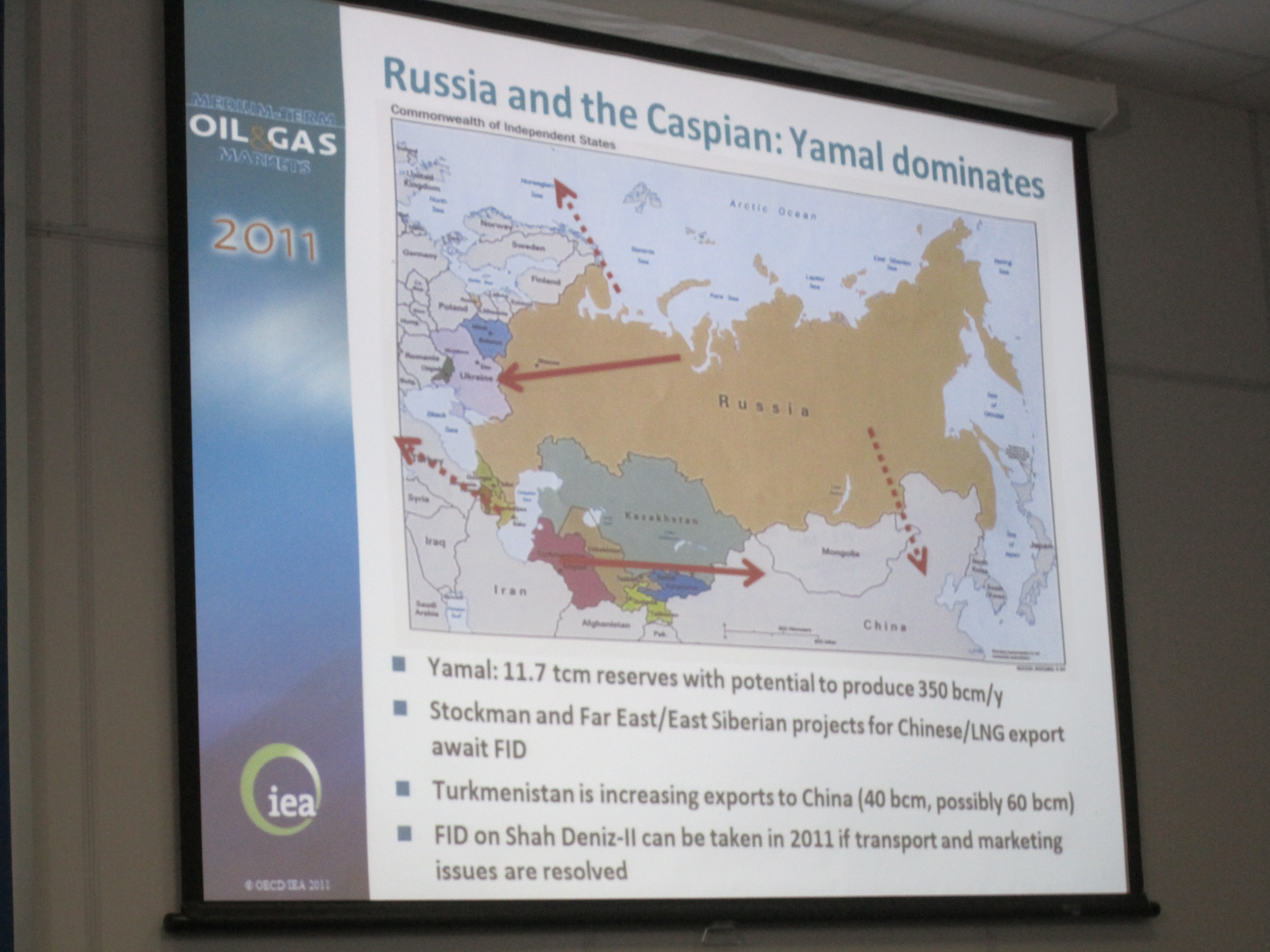 Speaking now is Nobuo Tanaka, Executive Director of IEA reading from a pre-written statement about the main points of their mid-term report. I asked Laszlo how they found themselves here in the first session, and he stated that while Russia is not a member of IEA, the country remains terribly important, especially in the area of communications on energy issues. Laszlo will be in Washington, D.C., next week presenting the report.
