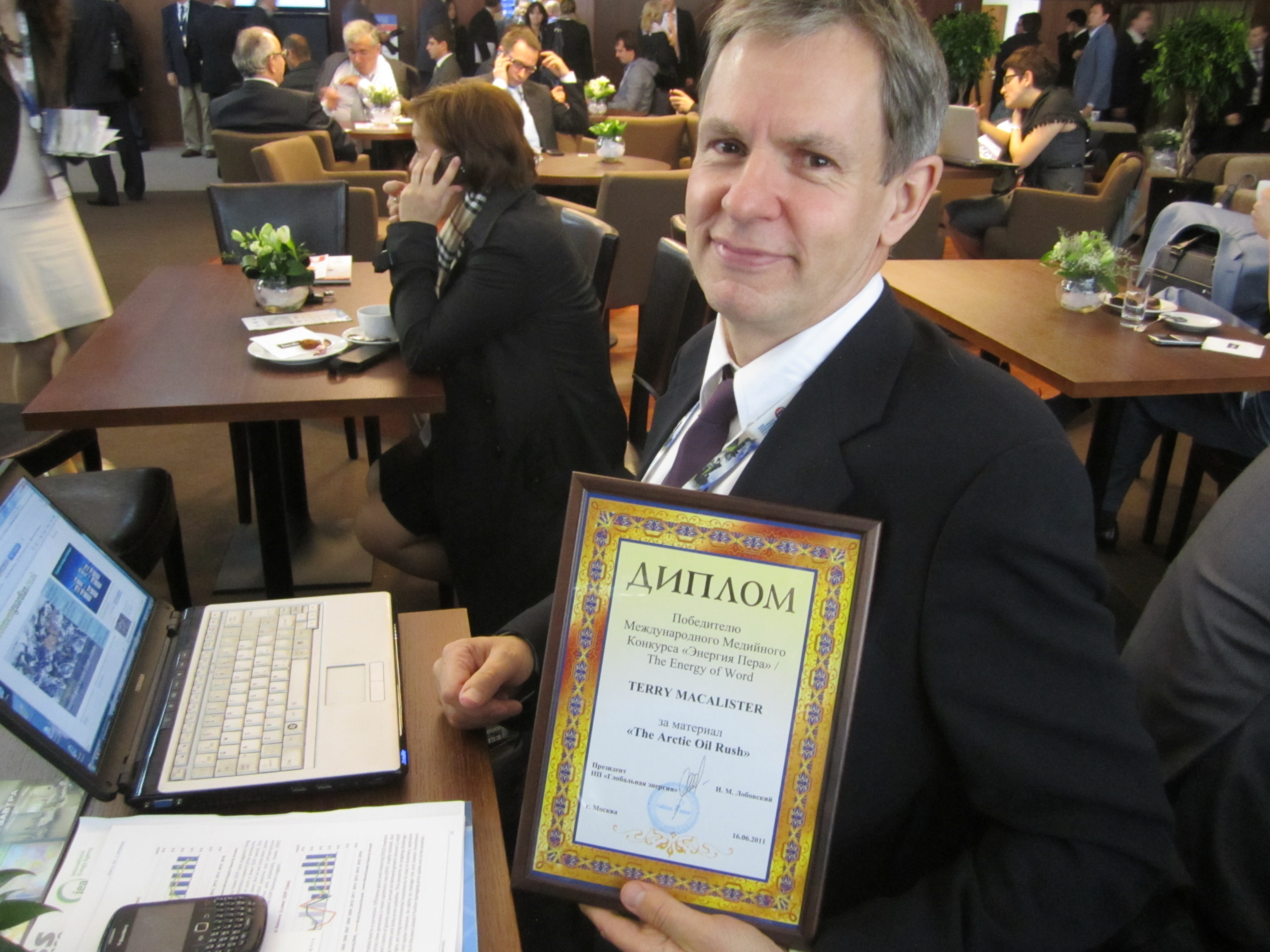 Phew! After it was all over, we all flooded out into the main room, which has dark wood paneling looking like a law office. Geoff, Laszlo and I chat briefly, and then I head for a seat to gather my thoughts, next to yet another journalist! Terry Macalister, who works for the Guardian newspaper in England, which is still free to read on the internet, and who has just been given his award for his research on Arctic oil development. Imagine that! We had a few things to say, considering we both work on the Arctic.