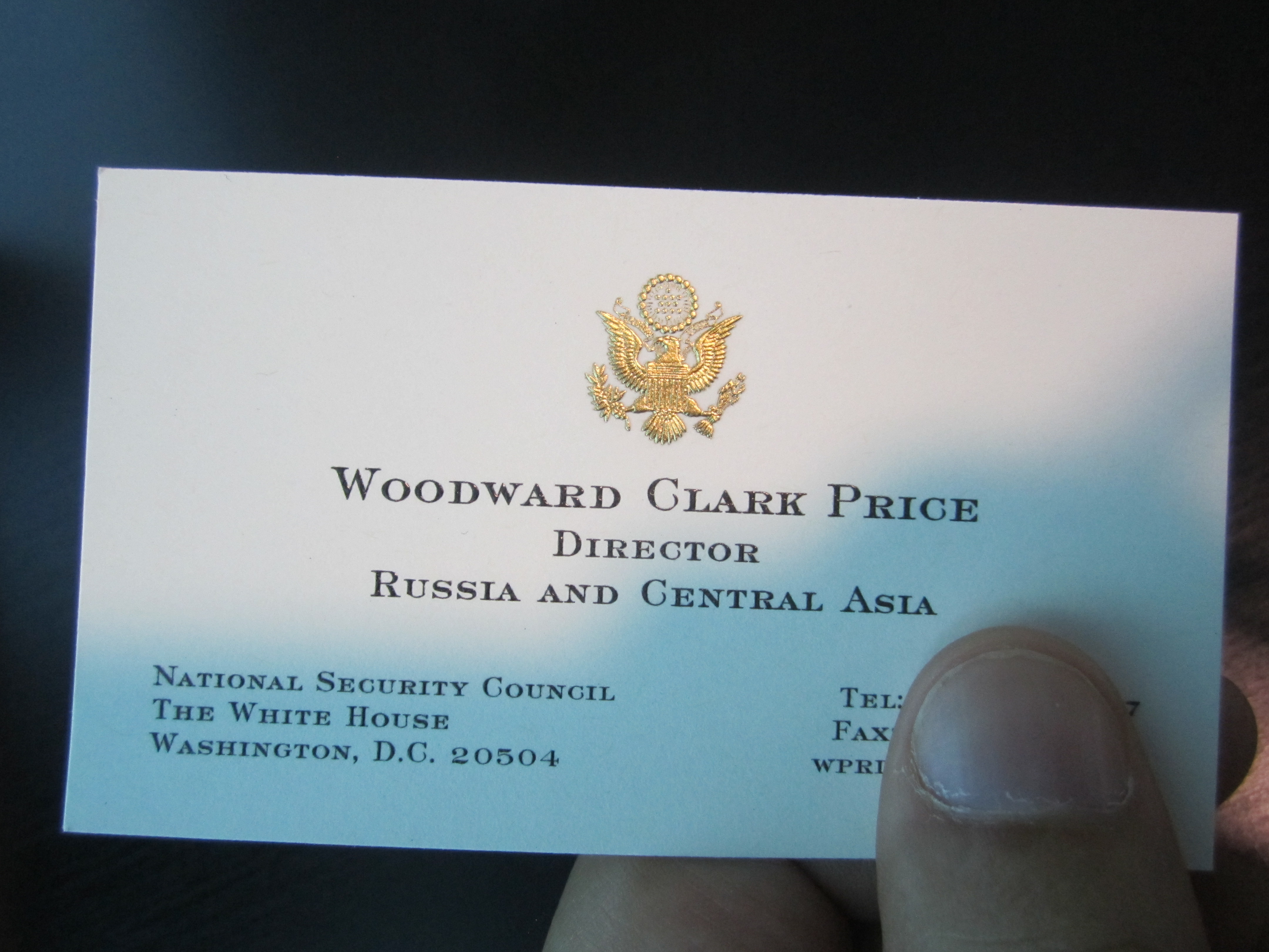 I thought his card looked totally cool, and I told him so. He thanked me for the compliment. Can you imagine, having “The White House” printed on your business card, next the word “Director” and the phrase “National Security Council”. Wow. That must be some kind of job.