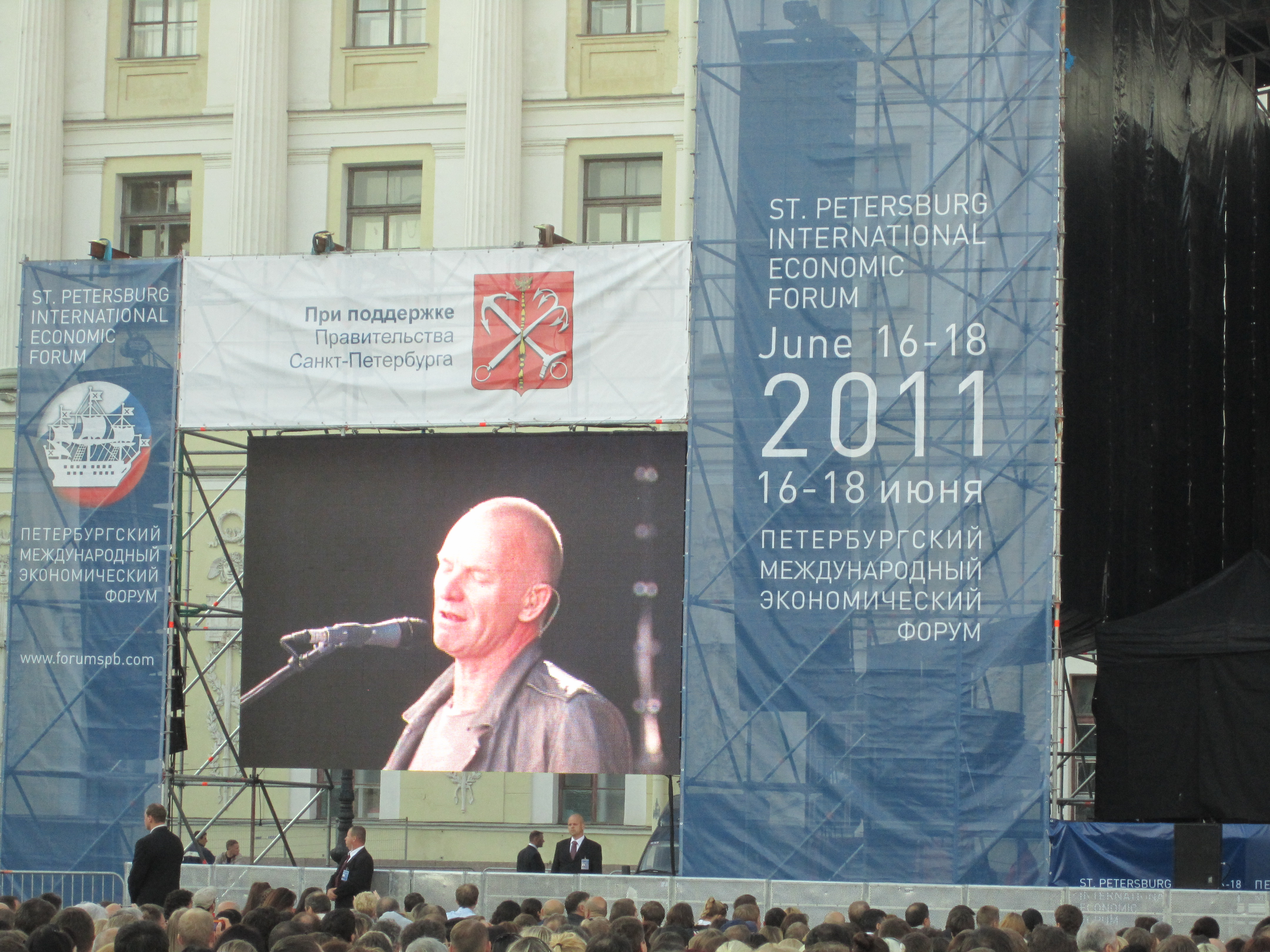 St. Petersburg loved him. I was quite impressed with the Economic Forum. At first, I didn’t want to go, since I sort of knew Sting’s music, it was difficult for me to see the point of it all. But then, standing there, in the midnight sun, in front of the Hermitage, in St. Petersburg, listening to Sting, as part of the Cultural Program for the International Economic Forum, everything seemed to make sense to me. And I realized that this really was some great ethnography, and a spectacular evening in Russia.