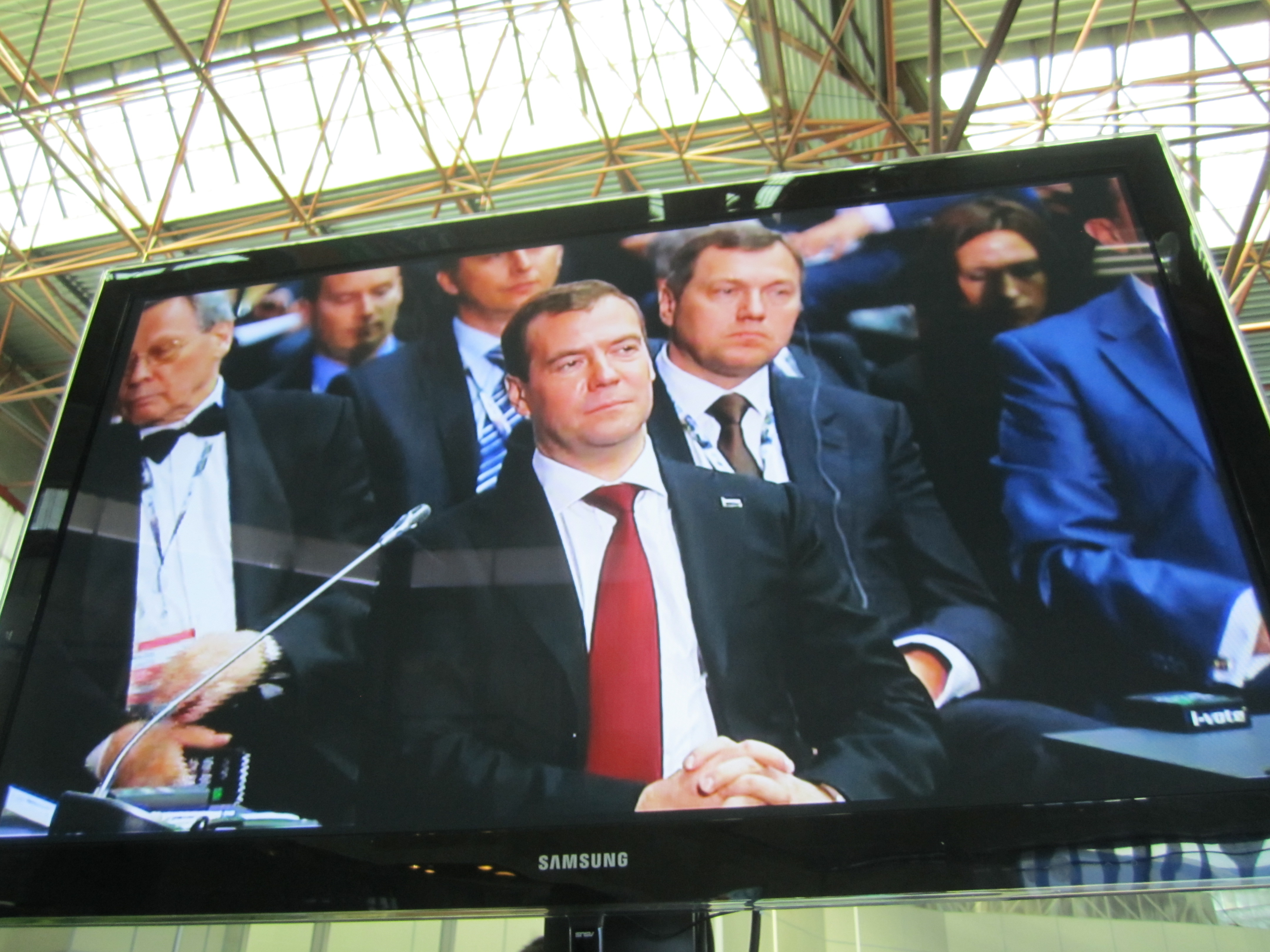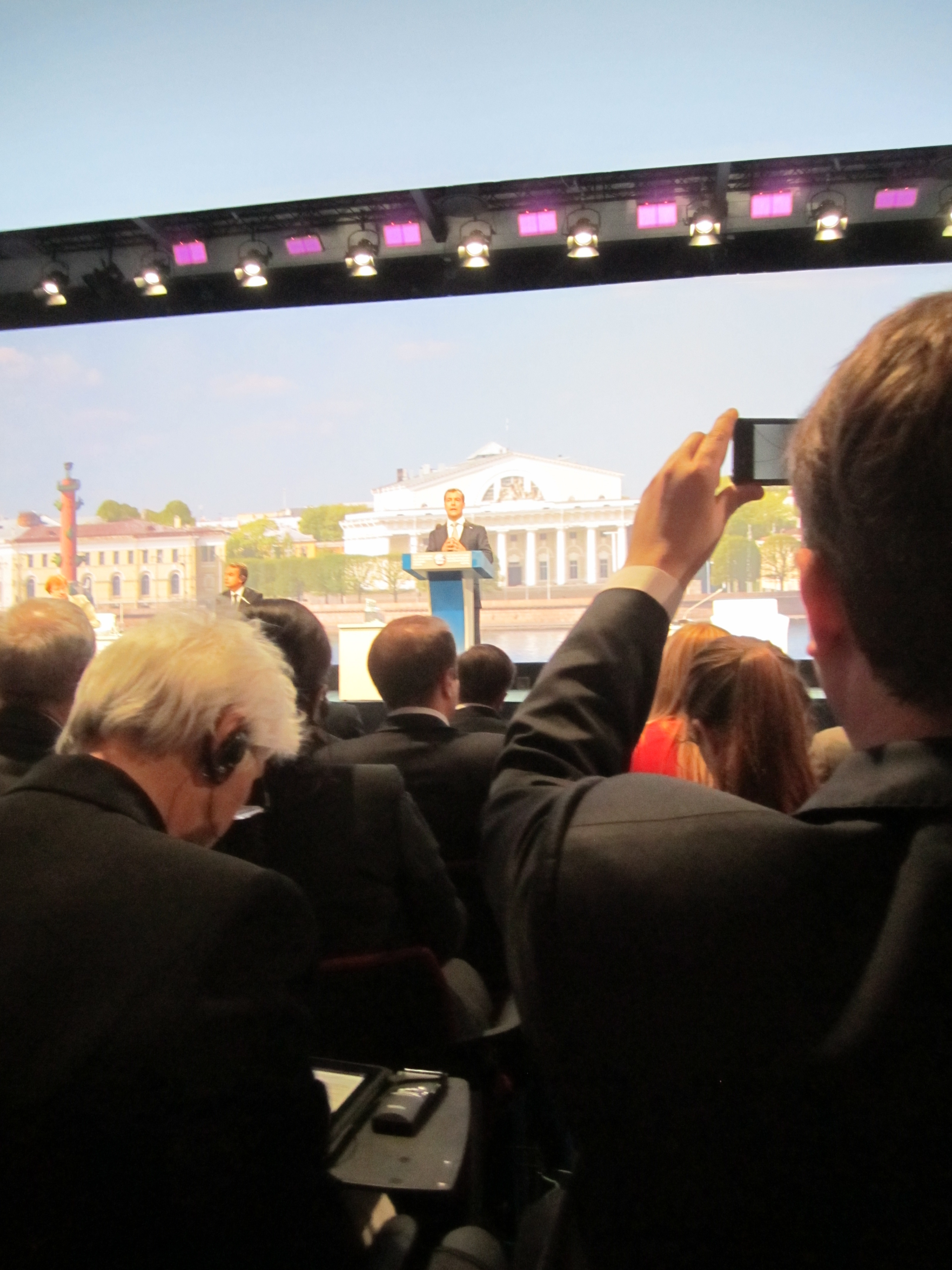 6/17: This morning begins with an opening plenary with key note speeches by Dmitry Medvedev, President of the Russia and Hu Jintao, President of China. Attending the plenary is limited to Package-One participants. I am Package-Two, so I have filed into a screening room.
