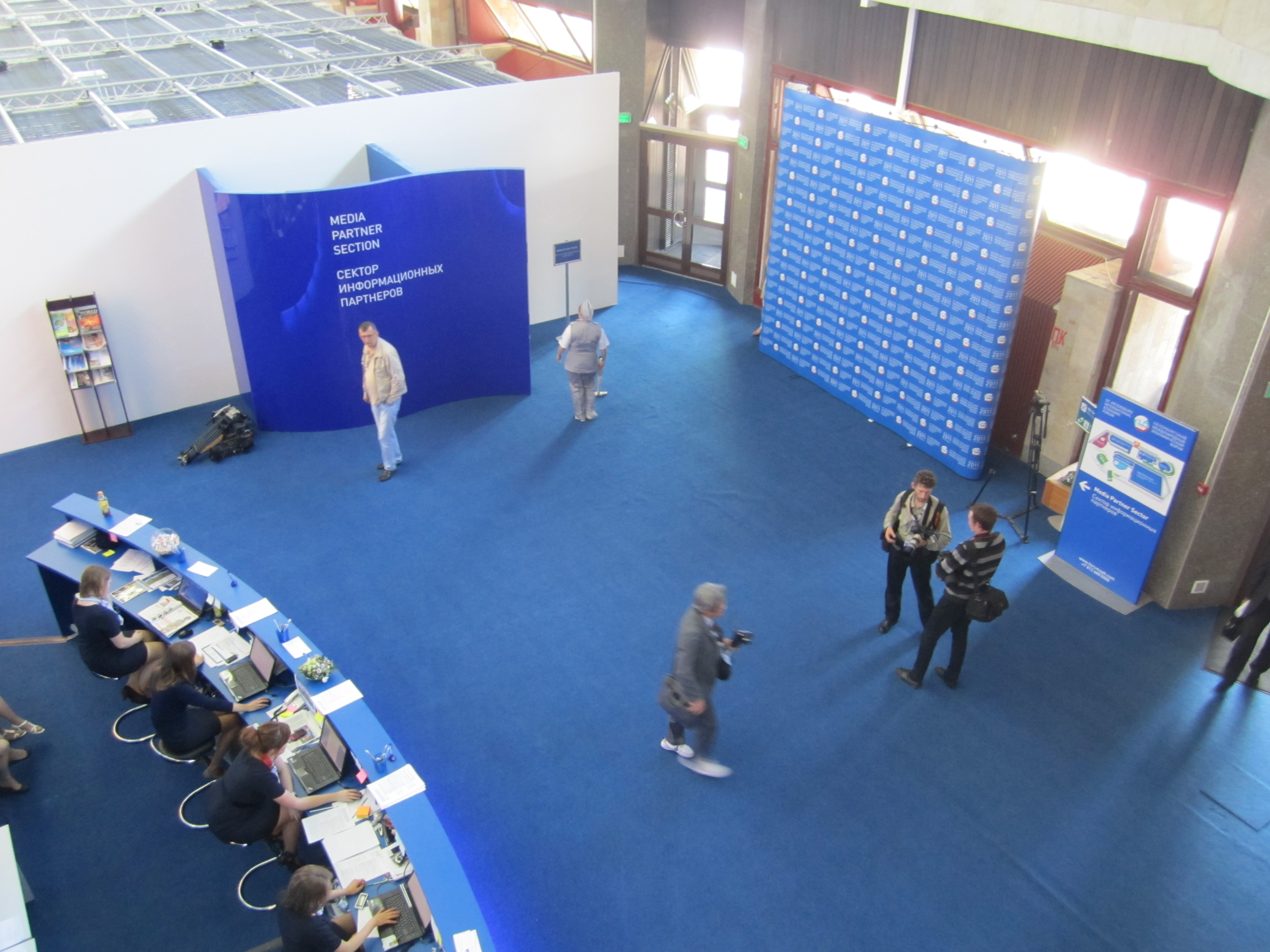 6/13: Today, I went to get accredited for the Forum. Attending the event requires an invitation from the organizing committee (which I received), then, getting an ID badge. This requires printing out a confirmation receipt with bar code, and passport in hand– and checking in at one of the booths.