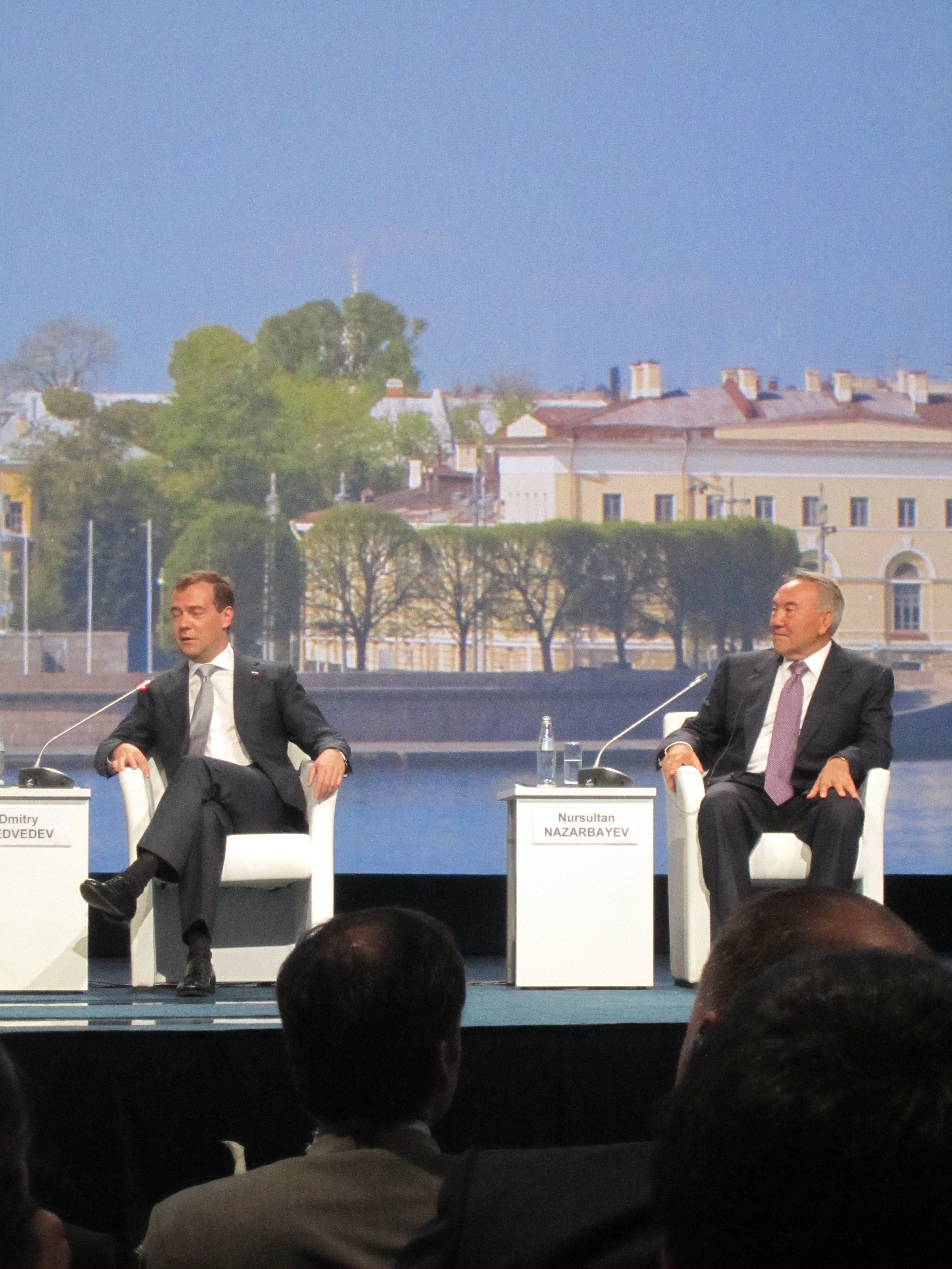 Filing-sitting-and-then-listening in the main hall, to Jose Luis Zapatero, PM of Spain, Taja Halonen, President of Finland, Nursultan Nazarbayev, President of Kazakhstan and Dmitry Medvedev, President of Russia. In that order. PM Zapatero droned on and on, about the need for what, I do not even remember. He was concerned about the economies in southern Europe but hopeful that everything would work out. Halonen talked about the good behavior of “Nordic sisters” and bad behavior of “southern [European] brothers”. Apparently, Greece’s debt crisis is getting on everyone’s nerves, at least in Western Europe.