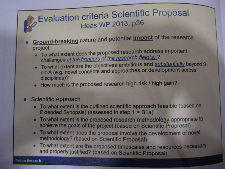 Proposal needs to be enthusiastic, stand out from the crowd. Imagine a friendly reviewer and write a proposal. Success rate is 10 percent. Do not make it complicated. Follow the guide application closely. High gain but low risk. Point to possible challenges but point to solutions. Identify novelty. Why is it ground breaking? Demonstrate how it can happen. Discuss the proposal with previous panel reviewers. A substantial proportion of “luck or unluck”.