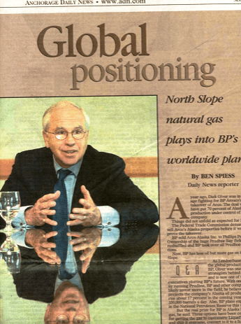 Quite some time ago now, Dick Olver, London-based head of global production for British Petroleum (BP), flew to Anchorage, Alaska to promote construction of an Alaska natural gas pipeline to deliver Arctic gas from Alaska’s North Slope of Alaska to markets in mid-continent. After his address, the Anchorage Daily News published a photograph of Olver. The man appears seated at a glass table with his hands reaching forward in a cupped-like manner. He grasps at an imaginary globe. The article headline is, “Global Positioning: North Slope Natural Gas Plays into BP’s Worldwide Plans.”