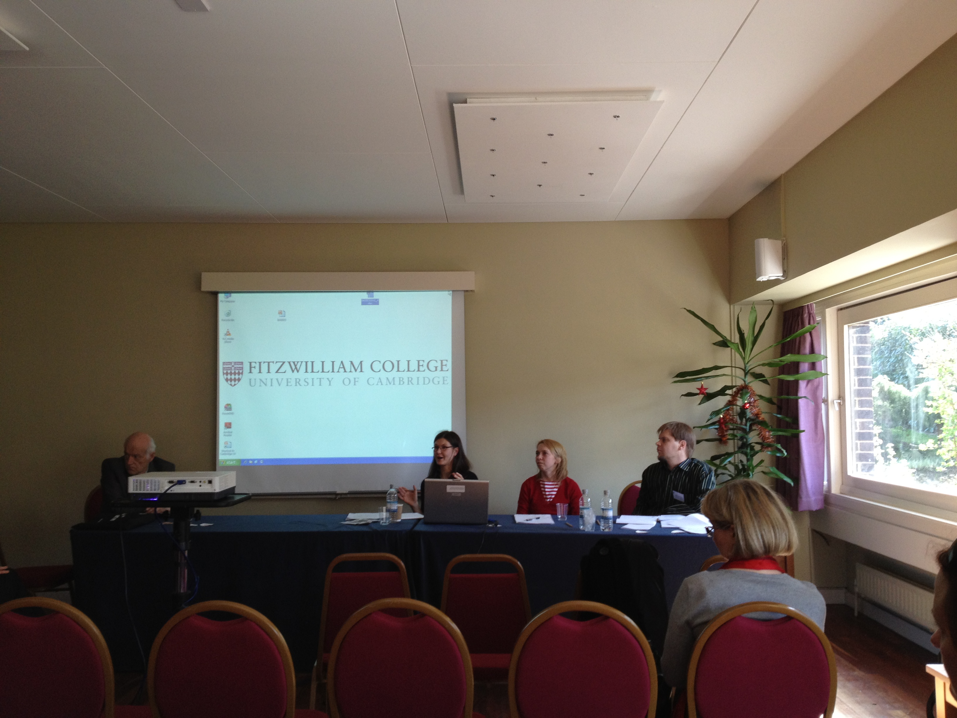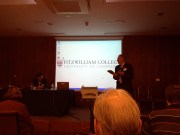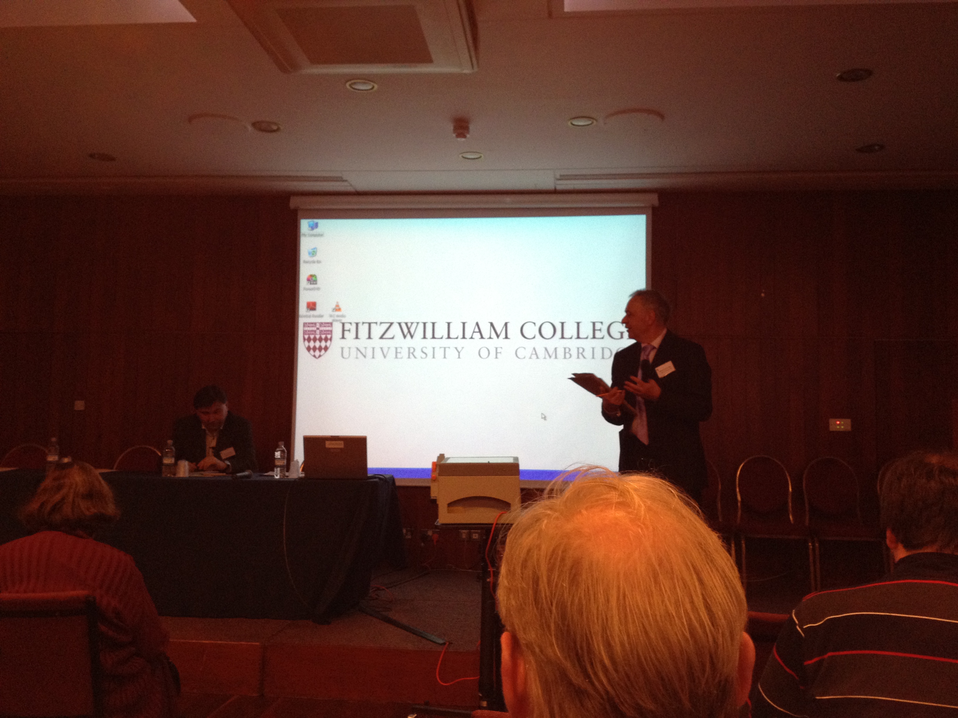 Noon: I just arrived at the Fitzwilliam college in Cambridge, and had a meal of tasty cucumber sandwiches meeting my fellow colleagues, all of whom I do not know and in fact, it may be that the organizer of my panel has not shown up. I do not see him on the panel at any rate. So we have a speaker now, Ivan Krastev, who is being introduced just this minute as a public intellectual. A long list of titles and awards are being rambled off, Wildrow Wilson fellow, University of Freiberg Suisse, fellow, contributing frequently to Le Monde, Wall Street Journal and so on and so forth. Applause.