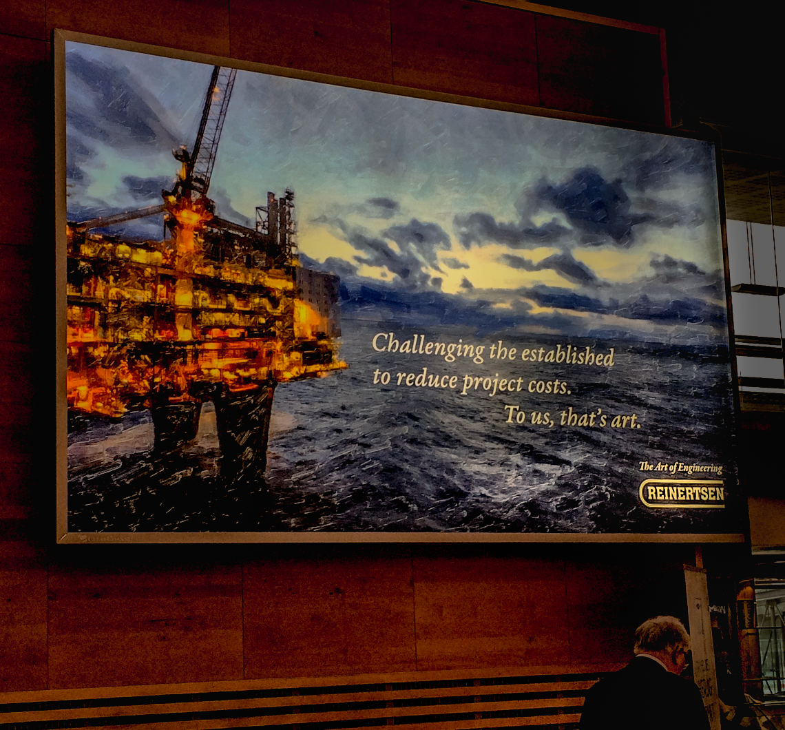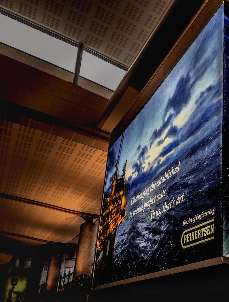 1/8: Passing through the Oslo airport, looking at an advertisement for Reinertsen consulting firm hanging inside the domestic terminal. Resting two meters above the floor, rising another 3 meters in height and nearly 4 meters in length, the image looms over passers-by and is recognizable at a distance of 20 meters.