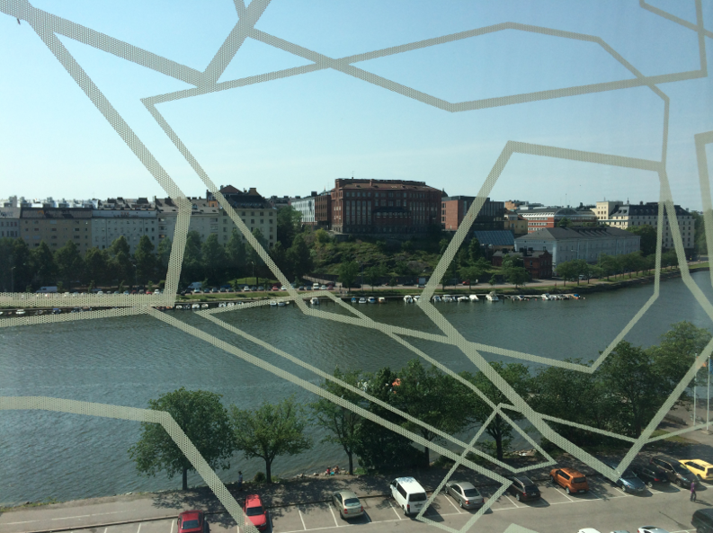 In the end, wondering aloud during dinner over the unique design feature that is visible at street level from the appearance of lines drawn on glass from the outside of the building, I thought about whether it curtails the view from inside, when looking out on the Helsinki landscape.