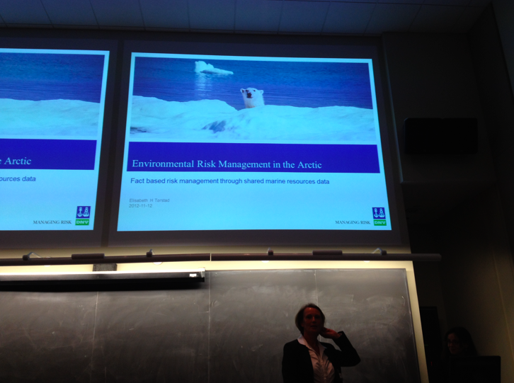 Wow. This turns out to be an interesting panel. Climate “regime shifts” in Marine environments. I barely got my tail over here, thinking the meeting room was close by, but turns out a 10 minute walk, so I missed some of Dr. Hepsø’s (Statoil anthropologist) opening. But Dr. Aarbakke is stirring things up already by jumping directly into Norwegian-Russian data sharing on climate change, marine environments in the Barents Sea area, which requires cooperation by all Arctic countries. “Key Message”.