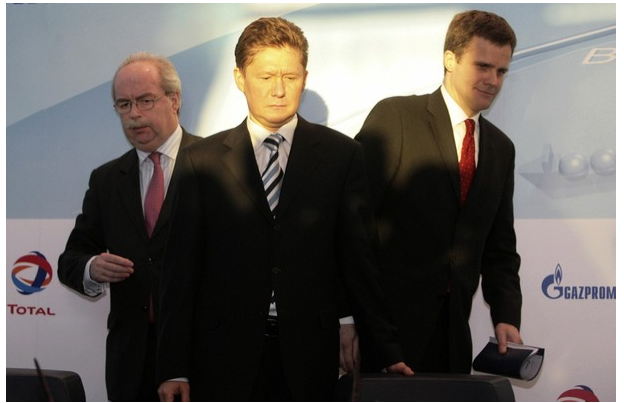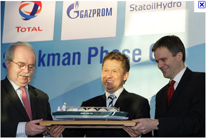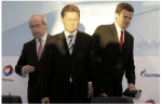 Now, take the three images as an installation of the everyday: First, they represent three individuals who are seen together as a group, symbolizing the formation of Shtokman Development AG, and; Second, the images reflect a constellation of time. As a serial temporality, they capture a beforehand and an afterward, along with a centrally posed, purposeful model image. As a spectral present, the three images were taken within minutes, perhaps within even seconds of each other. How do we know that the center image is the model image? Because it’s printed and framed! It achieves a notional (abstract) temporal point, by securing the present from its own materiality (it is in a state of decay).