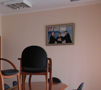 In front of the photo, you see a row of identically manufactured chairs. They are lined around a laminated rectangular boardroom table. The number of seats, sixteen in all (you do not count them), tells you suddenly that the room has been created for a particular kind of mutual exchange among persons of equivalence.