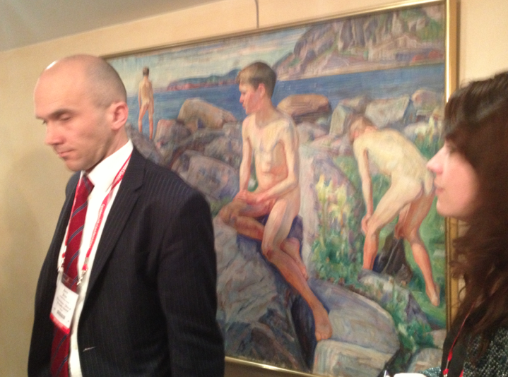 Some art remains, such as this image of innocence above — were it hanging in public in the United States, it would surely raise eyebrows, especially in the context of a business conference. Here, as you see by the reaction of those waiting in line to gather their coats, the painting registers negligibly as a signature of sexualized bodies.
